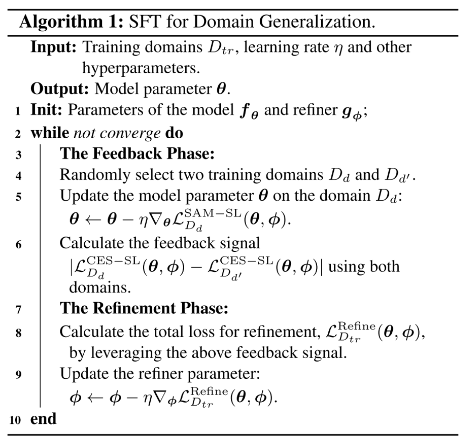 SFT는 feedback phase와 refinement phase 두 단계로 이루어져 있습니다. Feedback phase에서는 도메인 간에 inconsistency를 계산하여 이를 feedback signal를 구하는 단계입니다. Refinement phase에서는 feedback signal을 바탕으로 여러 도메인들의 loss landscape를 비슷하게 만들어주는 작업을 진행합니다. 이 과정을 반복하여 Figure 1 (a)에서 Figure 1. (b)와 같은 결과를 얻는 것을 목표로 합니다.