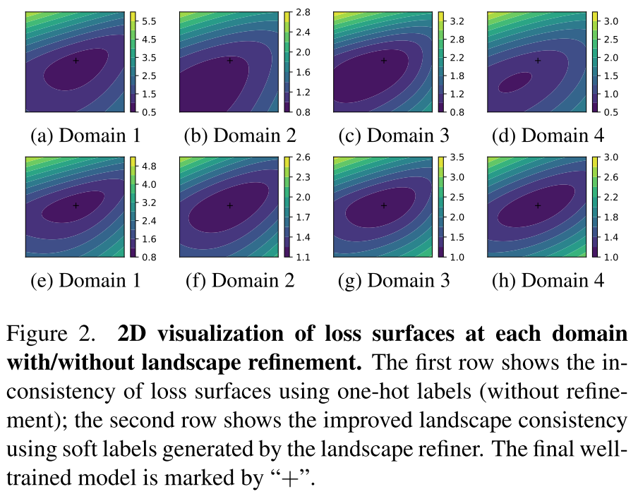 세 개의 클래스와 네 개의 도메인으로 이루어진 데이터셋을 생성하여 실험한 결과입니다. Figure 2에서 첫 번째 행은 SFT를 사용하지 않아 loss landscape가 불규칙적이며 optimal minima또한 미세하게 다른 반면, SFT를 통해 시각화된 도메인의 경우 loss landscape가 일정하며 optimal minima 또한 거의 같은 것을 확인할 수 있습니다.