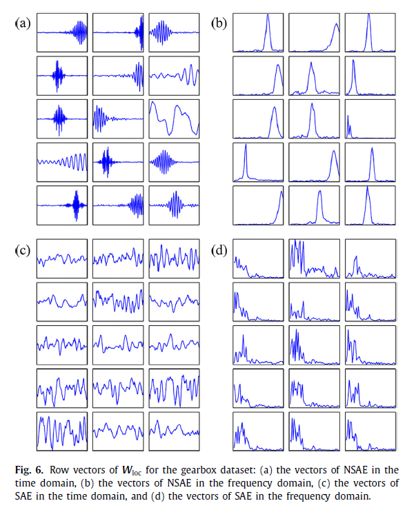 Normalized sparse autoencoder를 이용한 local connection network의 구조는 아래 그림과 같습니다. 하나의 sample을 생각해 보면, 먼저 raw vibration signal을 여러 개의 조각으로 나눕니다. 그리고 여기서 $N_S$개의 조각을 랜덤으로 뽑아서 Normalized sparse autoencoder의 input으로 넣습니다. NSAE의 weight matrix, $W_{loc}$은 아래 그림처럼 의미 있고, 동시에 다양한 피쳐들을 뽑아내도록 학습됩니다. 이 $W_{loc}$을 input layer의 segment와 각각 곱함으로써 feature를 추출하는 것입니다. 또한 shift-invariant한 feature를 뽑아내기 위해서 local layer의 값들에 평균을 취합니다. 이로써 time shift가 있더라도, local한 feature를 잘 발견할 수 있게 됩니다. 마지막 output layer는 softmax classifier로서, bearing fault condition을 판별합니다.