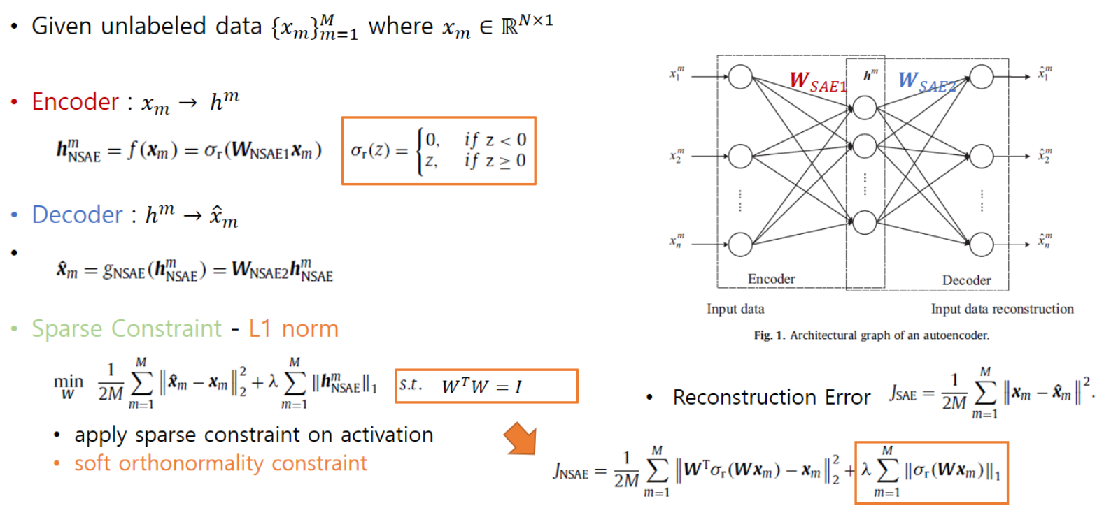 이 논문에서 제안하는 NSAE는 traditional sparse autoencoder와 달리 다음과 같은 네가지 특징을 가지고 있습니다. (1) Activation 함수로 Sigmoid 대신 ReLU를 사용하고, (2) bias term을 사용하지 않고, (3) KL divergence term을 L1 norm으로 대체하고, 마지막으로 (4) 목적 함수에 soft orthonormality constraint를 적용합니다. 저는 4번이 이 논문의 핵심 아이디어라고 생각했습니다.