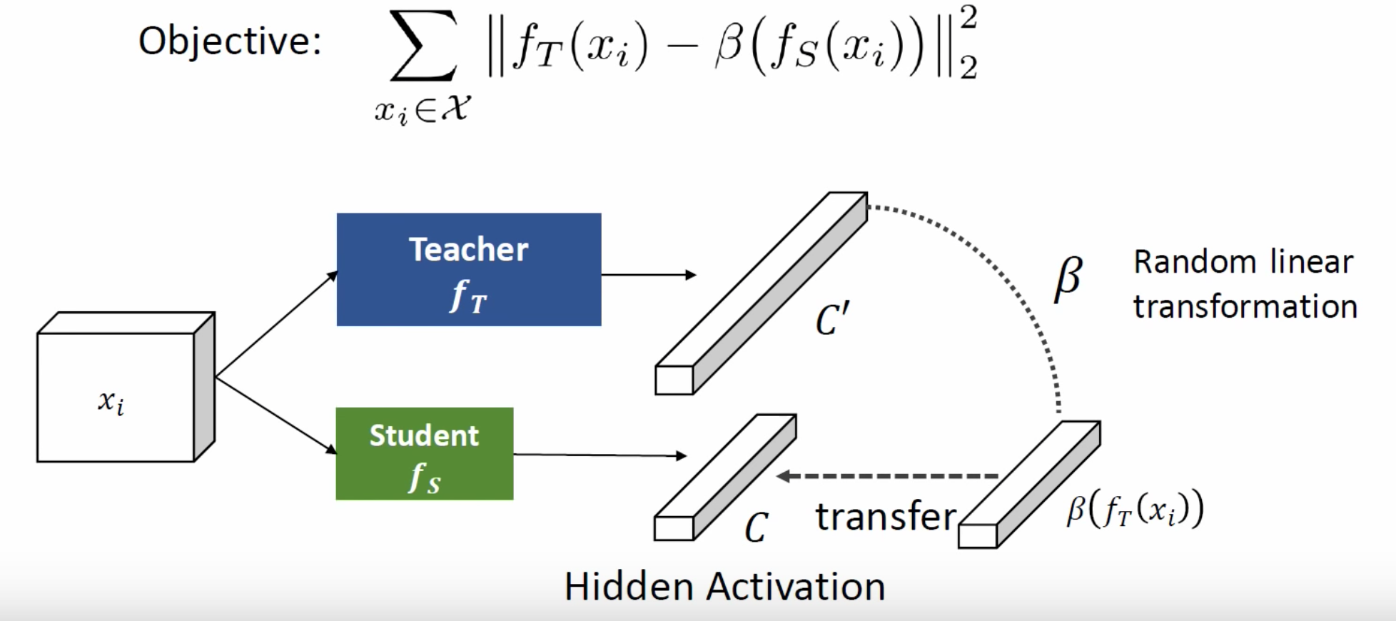 한편, Romero et al., ICLR, 2015처럼 Hidden Activation을 Transfer하는 방식도 소개되었습니다. 규모가 큰 Teacher model의 hidden activation (C')과 보다 규모가 작은 Student model의 hidden activation (C)이 아래의 그림처럼 주어질 때, 본 방식의 목적은 C'과 C가 같아지도록 만드는 것을 목표로 합니다. 그러나, C'과 C는 기본적으로 서로 다른 채널 개수를 갖기 때문에 L2-distance를 구할 수가 없으므로, C'을 C와 같은 벡터 공간으로 transform하기 위해 적절한 transform layer를 선택해야하는 조건이 있습니다.
