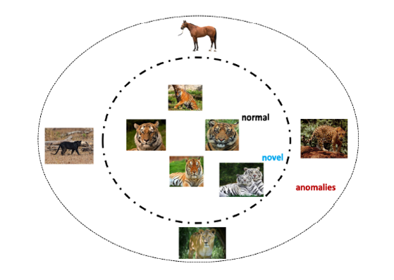 위의 그림에서 호랑이 사진을 정상 데이터, 다른 동물 사진을 비정상 데이터로 분류한다고 할 때, 백호랑이 사진은 어디에 들어가야 할까요? 백호랑이 사진은 호랑이의 범주에는 포함되지만, 다른 일반적인 호랑이 사진보다 anomaly의 경계에 가까운 곳에 위치하고 있을 것입니다. 이런 백호랑이 사진과 같은 관측치를 novelty라고 합니다. 이전 데이터에서 보지 못한 새로운 패턴이지만 anomaly와 달리 정상 데이터 생성 process로부터 생성되었다는 차이점이 있습니다.