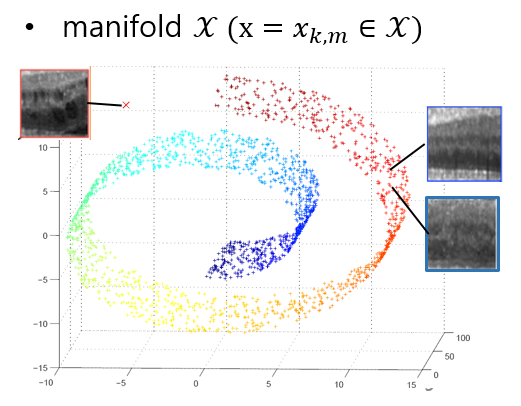 정상 이미지들이 이런 manifold를 이루고 있다고 하면 manifold위의 점들은 각각 다른 정상 이미지 패치를 나타냅니다. 하지만 비정상 이미지는 이 manifold 바깥에 위치하게 되겠죠. 여기서 제일 중요한 점은 정상데이터로 학습시킨 GAN의 Generator가 $z$에서 $x$로의 매핑을 나타낸다는 것입니다.