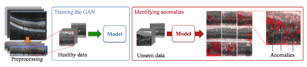 이 논문에서 수행하고자 하는 task는 망막의 이미지 샘플을 보고 이 사진이 질병이 있는 사람의 것인지를 판별하고 어떤 부분이 비정상인지를 찾아내는 것입니다. 이를 위해서 GAN을 이용한 비지도학습을 수행합니다. 아래 그림이 전체 아이디어를 잘 보여주는데요, 정상 데이터로만 GAN을 학습해서 정상 데이터를 잘 생성할 수 있는 모델을 만든 다음, 비정상 데이터를 이 모델의 입력으로 넣어서 원래 이미지와 얼마나 비슷하게 복원할 수 있는지를 봅니다.