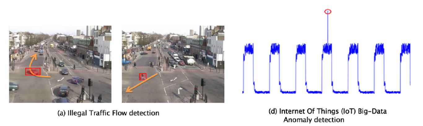 대부분의 데이터와 너무 달라서, 아예 다른 data generative process를 통해 만들어졌을 것 같은 샘플들을 말합니다. 따라서 비정상 데이터는 데이터의 오류로부터 발생할수도 있지만, 이전에 알려지지 않은 새로운 생성 매커니즘에서부터 비롯된 것일수도 있습니다. 아래 그림은 각각 교통 데이터, 사물인터넷 센서 데이터에서의 비정상 데이터 예시를 보여줍니다. 빨간색으로 표시된 부분이 비정상 데이터입니다.