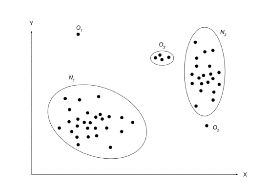 위 그래프를 보면, $N_1$ 과 $N_2$ 영역에 거의 모든 관측치들이 몰려 있기 때문에 이들은 정상 데이터로 분류됩니다. 하지만 $O_3$ 영역과, $O_1$, $O_2$의 관측치들은 대부분의 관측치들이 몰려 있는 영역과 멀리 떨어져 있습니다. 따라서 이들을 비정상 데이터로 볼 수 있습니다. 다시 말해서 정상 데이터의 분포에 속해 있지 않은 outlier들을 찾는 것이죠.
