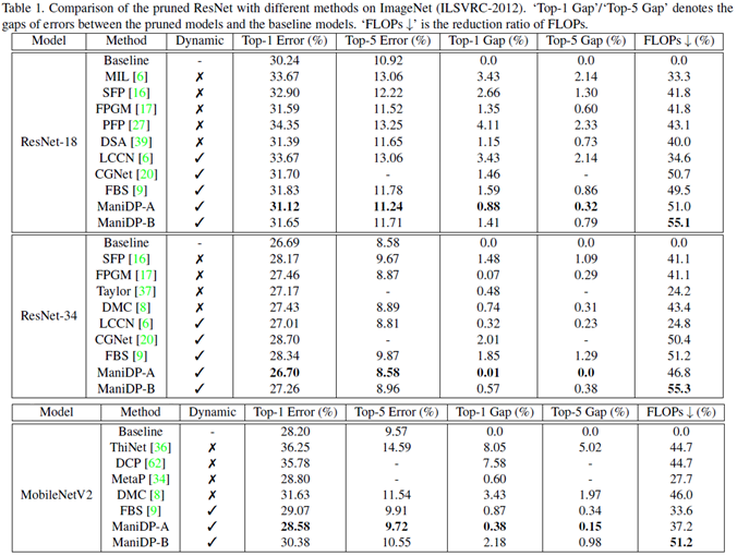 ManiDP-A와 ManiDP-B는 각각 다른 pruning rates를 가지는 모델입니다. ManiDP는 다른 방법론들과 비슷한 수준으로 FLOPs를 줄이면서도 가장 좋은 성능을 보입니다.