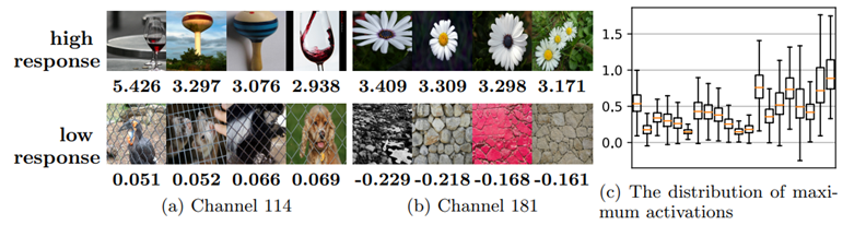 Pretrained ResNet-18로 imagenet sample을 추론해 보면, 특정 채널(114, 181)의 아웃풋은 이미지에 따라 많은 차이를 보입니다. 또한 (c)에서 볼 수 있듯이 20개 channel의 maximum activation의 분포를 그려보면, 채널 간에 큰 편차가 있는 것을 알 수 있습니다.