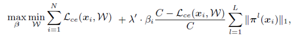 앞에서 설명했다시피 기존 연구들에서는 모든 instance에 대해 같은 weight coefficient, 즉 $\lambda$가 사용되었습니다. 하지만 여기서는 CE loss가 높으면 더 낮은 $\lambda$값을 사용하고, CE loss가 낮으면 더 높은 $\lambda$값을 사용함으로써 각 instance마다 adaptive하게 sparsity penalty를 적용합니다. 또한 $\beta = \{\beta\}_{i=1}^{n} \in \{0,1\}^N$이라는 binary learnable parameter를 사용하는데 이는 $i$번째 instance에 대응하는 sub-network가 pruning 되어야 하는지 여부를 의미합니다. 최종적으로 optimization objective는 다음과 같이 정의됩니다. $C$는 instance complexity threshold로서 사전에 정의됩니다. 실험적으로 이전 epoch에서 구한 전체 dataset에 대한 cross entropy 평균을 사용한다고 합니다.