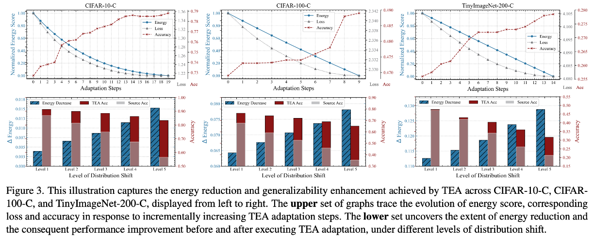 본 논문은 Covariate shift에 대하여, TTA 방법들 중 normalization 방법론, pseudo label을 사용하는 방법론, entropy minimization의 방법론과 비교하였으며, in-depth 스터디로 1. energy 감소와 generalizability 개선 2. distribution에 대한 perception 그리고 generation 능력 3. calibration 개선에 대해 살펴보았습니다.